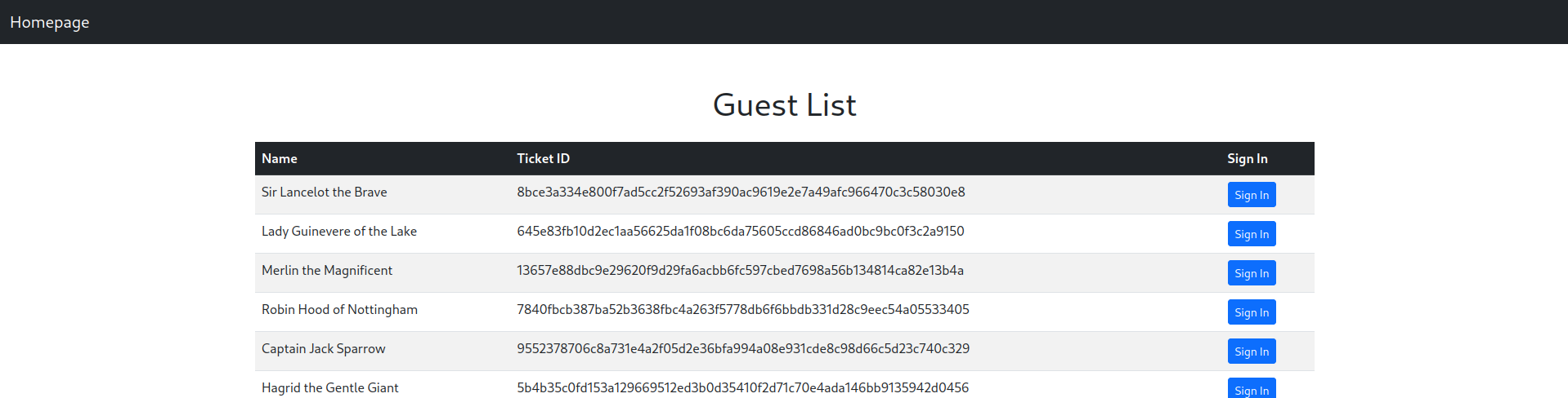 There, we can see a list of guests which each have a name and a ticket ID. Clicking on the Sign In button brings us to a simple welcome page with no further options.