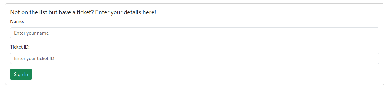 We can also use the form at the bottom of the site to enter a specific name and ticket ID. If our name and ticket ID figures in the list, we are let in to the welcome page.